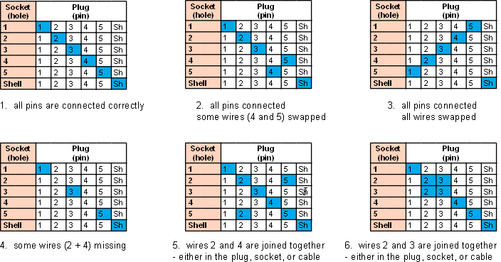 Connect one end of continuity tester to hole 1 on the socket. Connect the other end of the continuity tester to each of the pins in the plug, in turn. Highlight the pin number on the grid when you get an indication when the circuit is made. Repeat the process with the continuity tester in hole 2 and so on, until you have completed the grid. Also test between the socket shell and each pin in turn, and the plug shell. If hole 1 goes to to pin 1, and nowhere else, then you should only have pin 1 highlighted. If no pins are highlighted, then it could mean that that wire is missing, or it may be a false reading. Check the continuity tester connections and try that socket row again. If you have more than one number, or a number and the shell, highlighted in a row or column, then it probably means that there is a short between those wires in the cable. Confirm by testing again. If it is still showing that there may be a short, then do not use the cable.