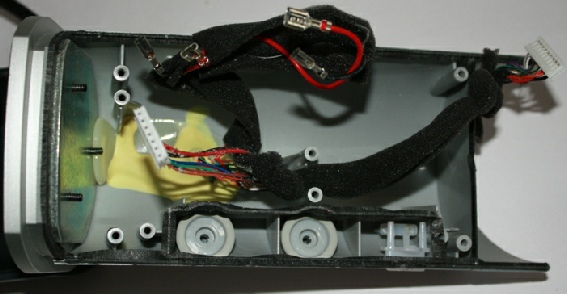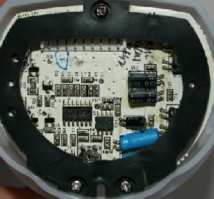 The light PCB is at the base of the top, held secure by a ring of black plastic which is secured to the top by three screws. Once you have removed the screws, you may find that the plastic has some yellowish rubbery adhesive material between it and the PCB / components. This will have to be gently removed before the black plastic can be removed.