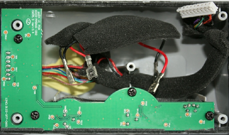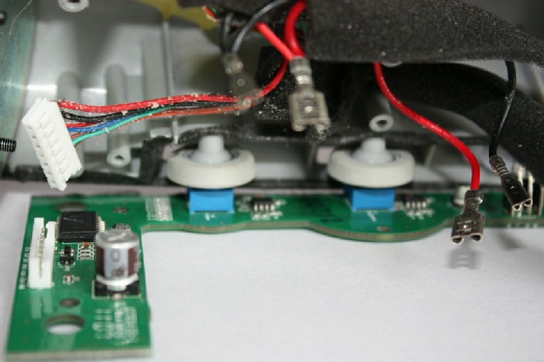 Be careful you don’t lose the grey volume / brightness knobs. They are held in position when the control panel is in place, but when you remove the PCB they may fall out. You will need to remove them anyway, as they will need to be put on the volume / brightness spindles before the PCB is replaced. To remove the knobs, just put something down the side and use it to push the knob up. There is nothing holding the knob in place in the case.