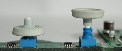 You will need to put the knobs on the spindles before replacing the PCB. As with most control knob spindles, the spindle is round with a flat edge on one side near the top. The hole in the centre of the knob is the same shape. This gives the knob a “key” on the spindle. Make sure you put the knob the correct way up and then align the flat piece of the centre with the flat piece of the spindle. It’s easy to do. Just place the knob on the spindle and gently turn the knob until it drops down to sit on top of the blue base. The white top of the spindle will then be level with the hole at the top of the knob.