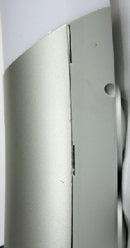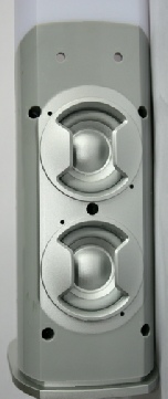 The speakerlight has a black / dark grey front. This has three lugs on either side that slot into three grooves on the side of the silver case. There are also two “studs” near the top on the inside of the front