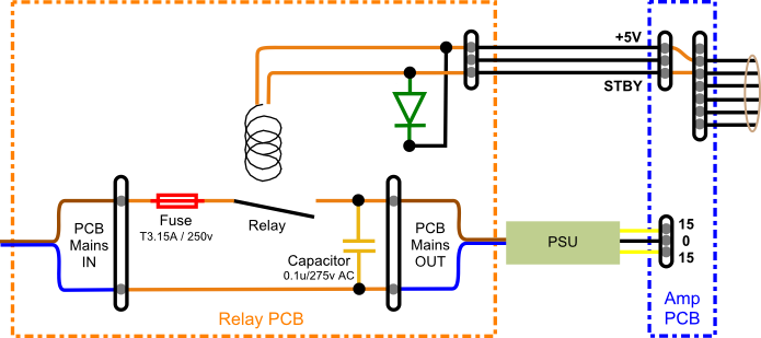 The PSU is contained in the subwoofer box and is connected to the mains plug via a mains relay.