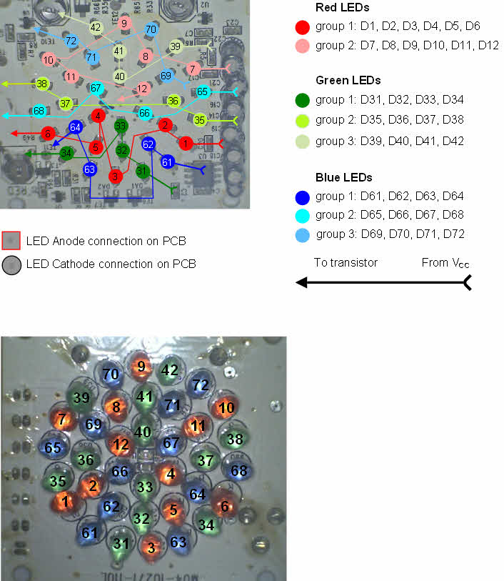 Fig. WTL1: The wallwasher light LED groups and their connections from the underside of the PCB