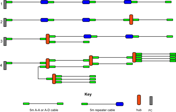 2 has one device at the end of 20m cable using two repeaters and one hub. Further devices can be added at the hub